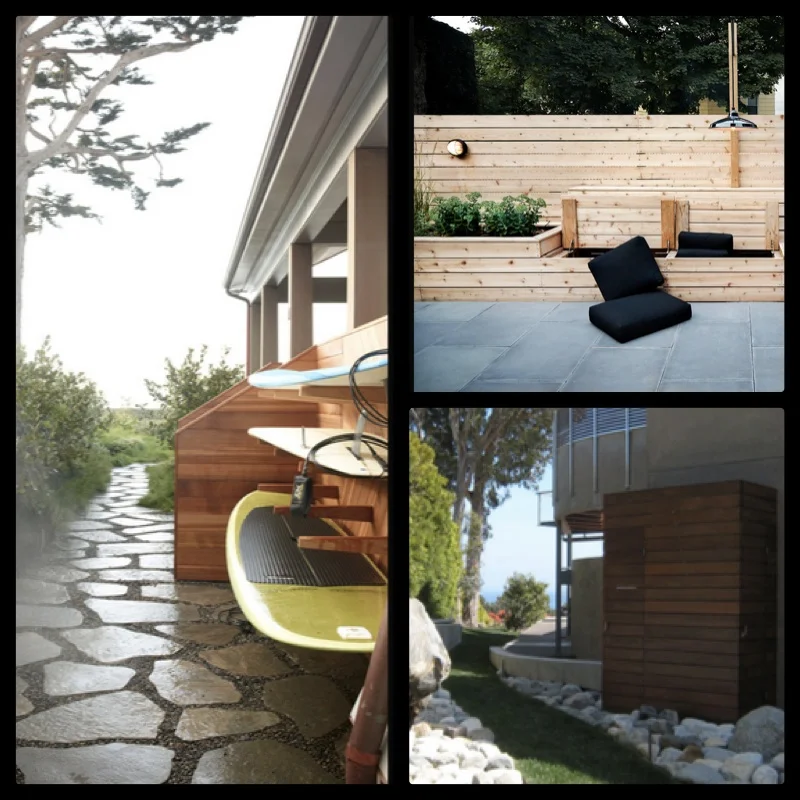Consider where you could use built-ins for storage. We all have different storage needs. If you have a young family, a seating bench that doubles as storage could be great for cushions or outdoor toys. A sleek shed could hold bikes or a lawn mover and other large equipment. Naturally, the surfing life requires its own solutions for board storage, and I love how the designer turned storage into a design feature.